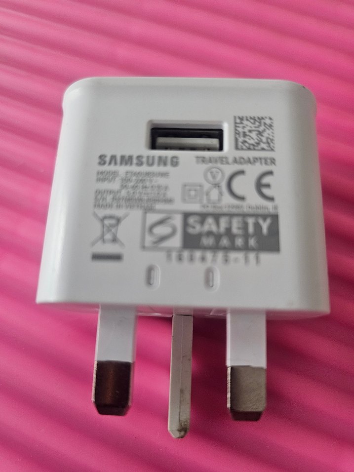 USB portlu, CE sertifikalı ve güvenlik işaretli beyaz Samsung telefon şarj adaptörü. Seyahat için uygundur. ⚡