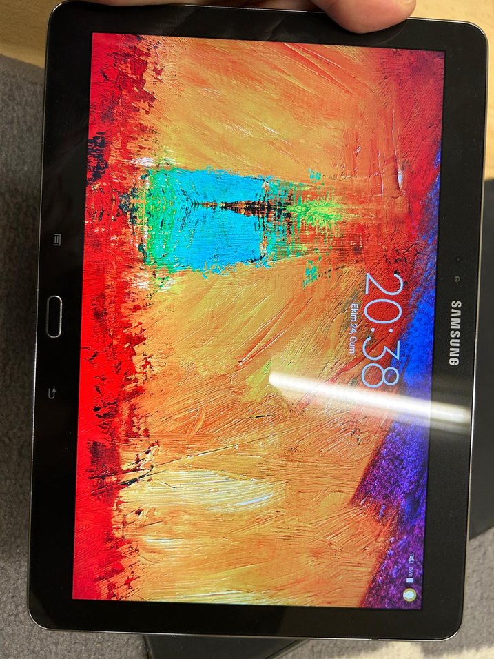 Samsung tablet, çok renkli canlı ekran ve net dijital saat arayüzüne sahiptir. Ön kamerası ve ince siyah çerçevesi bulunur. Google play güncelleme.yapmiyor