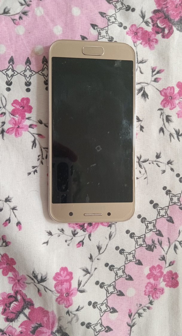 Bej renkli Android akıllı telefon, ön tarafta dokunmatik ekran ve fiziksel ana ekran düğmesine sahiptir. Şık tasarımıyla dikkat çeker. bozuk çalışmıyor arka kapak yok