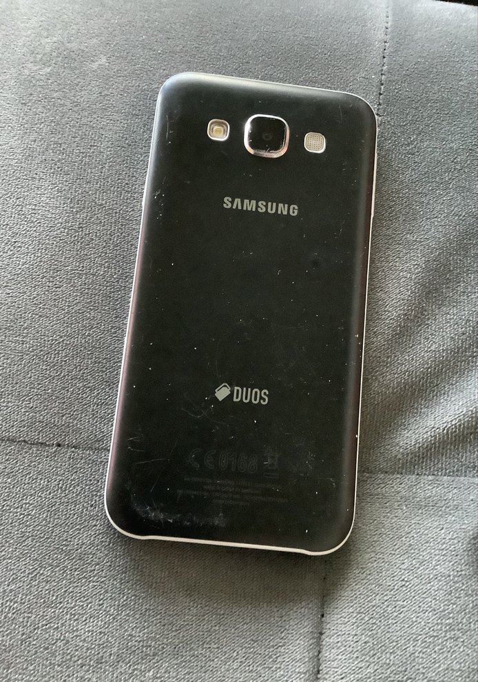 Samsung Duos siyah Android telefon, çift SIM özelliği, arka kamera ve şık koyu tasarımıyla dikkat çekiyor.