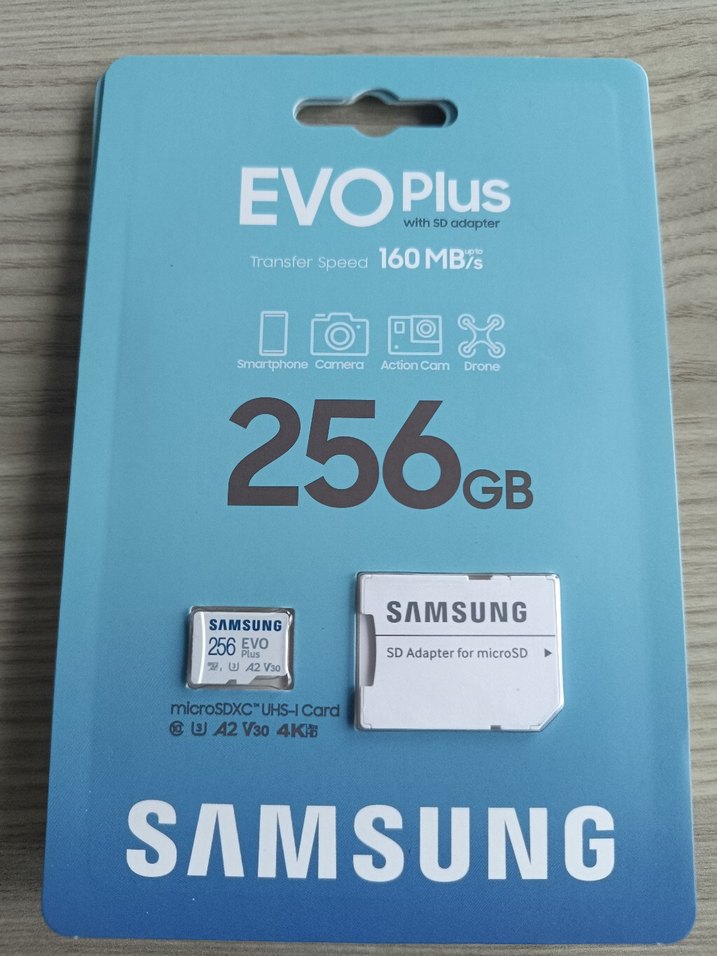 Samsung EVO Plus 256GB microSD hafıza kartı ve SD adaptörü, 160 MB/s aktarım hızı sunar. Akıllı telefon, kamera, aksiyon kamerası ve drone için uygundur.