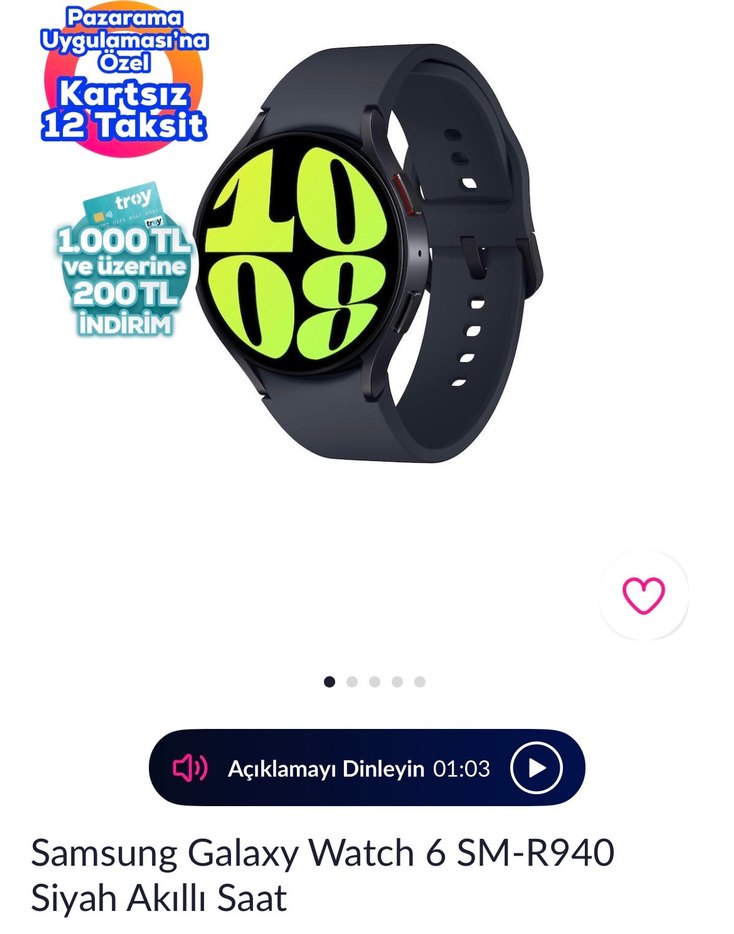 Samsung Galaxy Watch 6 SM-R940 siyah renkte, canlı ekrana sahip ve 12 taksit imkanı sunar. Şık tasarımlı akıllı saat.