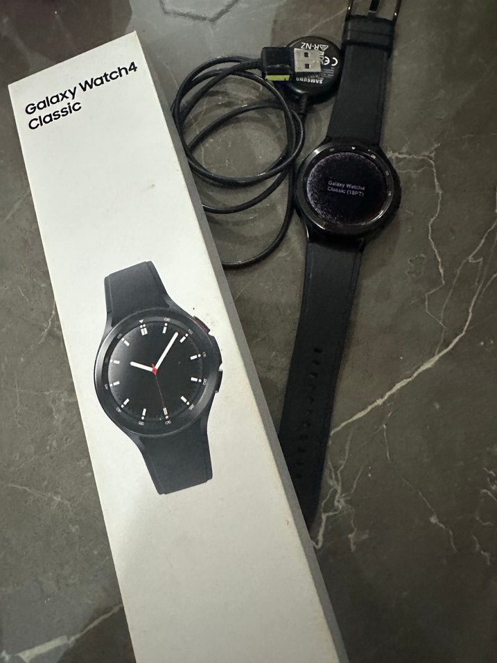 Samsung Galaxy Watch4 Classic, siyah renkte yuvarlak ekran ve şık kayış ile geliyor. Şarj kablosu da pakete dahil. ⌚