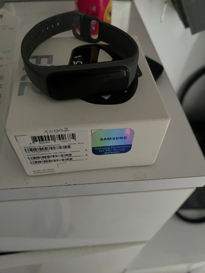 Samsung akıllı bileklik, şık koyu tasarımı ve orijinal kutusuyla birlikte gelir. Günlük aktiviteleri takip etmek için uygundur. ⌚