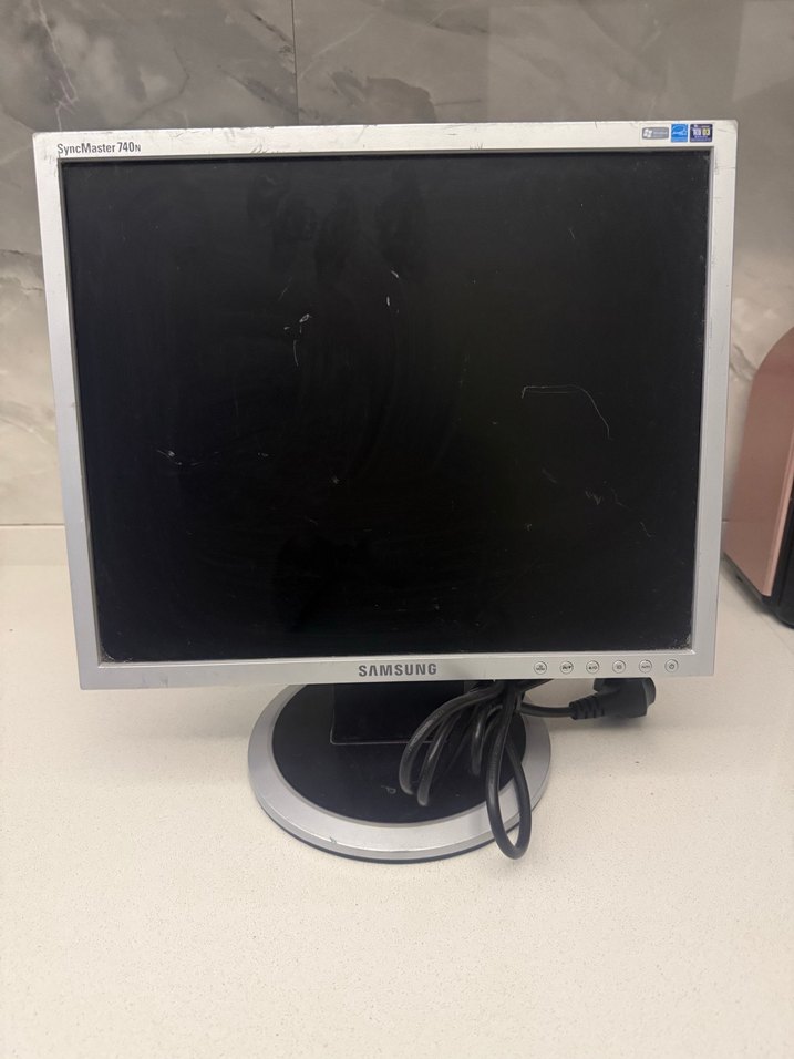 Samsung SyncMaster 740n monitör, gri çerçeve ve kare ekran tasarımına sahiptir. Önünde kontrol düğmeleri ve yuvarlak taban bulunur. Genel bilgisayar kullanımı için uygundur. ️