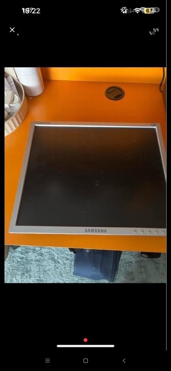 Samsung marka, önünde kontrol düğmeleri bulunan, gümüş çerçeveli masaüstü monitör. Arkasında turuncu masa var. ️