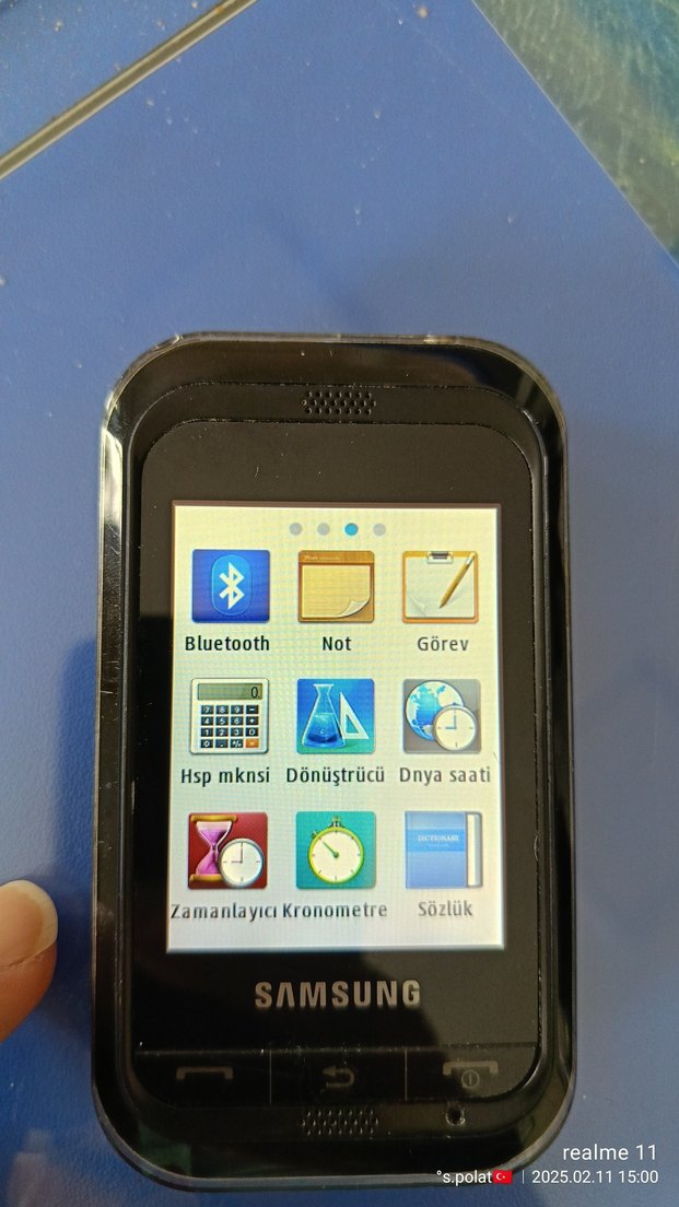 Samsung marka koyu mavi renkte, Bluetooth, not, görev, sözlük, zamanlayıcı, kronometre, hesap makinesi, dönüştürücü ve dünya saati özelliklerine sahip telefon.