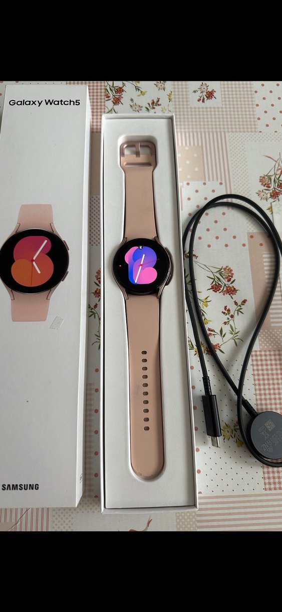 Samsung pembe renkli akıllı saat, yuvarlak ekran ve silikon kayış ile. Şarj kablosu dahil. Günlük aktiviteleri takip etmek için uygun. ⌚