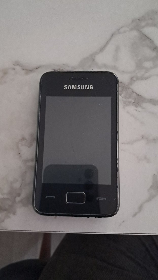 Kompakt tasarımlı siyah SAMSUNG Android telefon, dokunmatik ekranlıdır. Temel akıllı telefon işlevlerine uygundur.