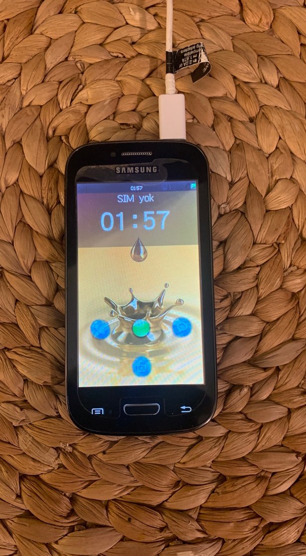 Samsung marka koyu renkli Android telefon, ekranda 'SIM yok' ve saat 01:57 görünüyor. Dokunmatik ekran ve temel navigasyon tuşları bulunur. Telefon çok iyi durumda