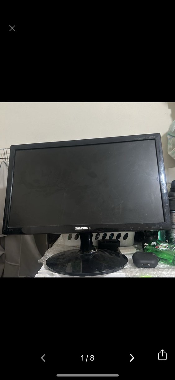 Samsung siyah bilgisayar monitörü, geniş ekran ve yuvarlak tabanlı, çeşitli masaüstü kurulumlarına uygundur. ️