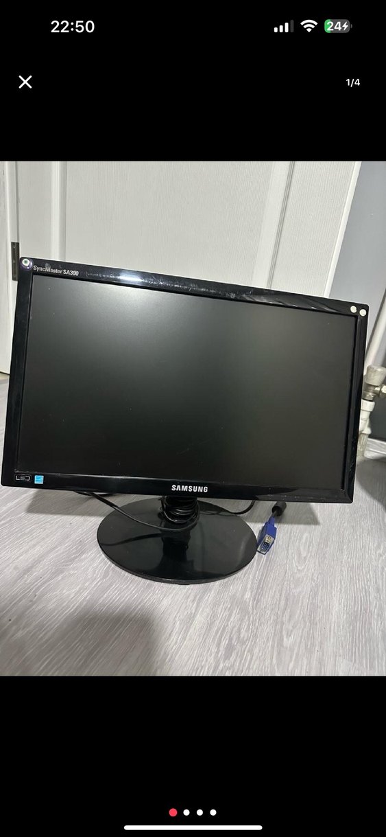 Samsung siyah bilgisayar monitörü, yuvarlak taban ve VGA bağlantısı ile net görüntü sağlar. AMSUN yazısı bulunur. ️