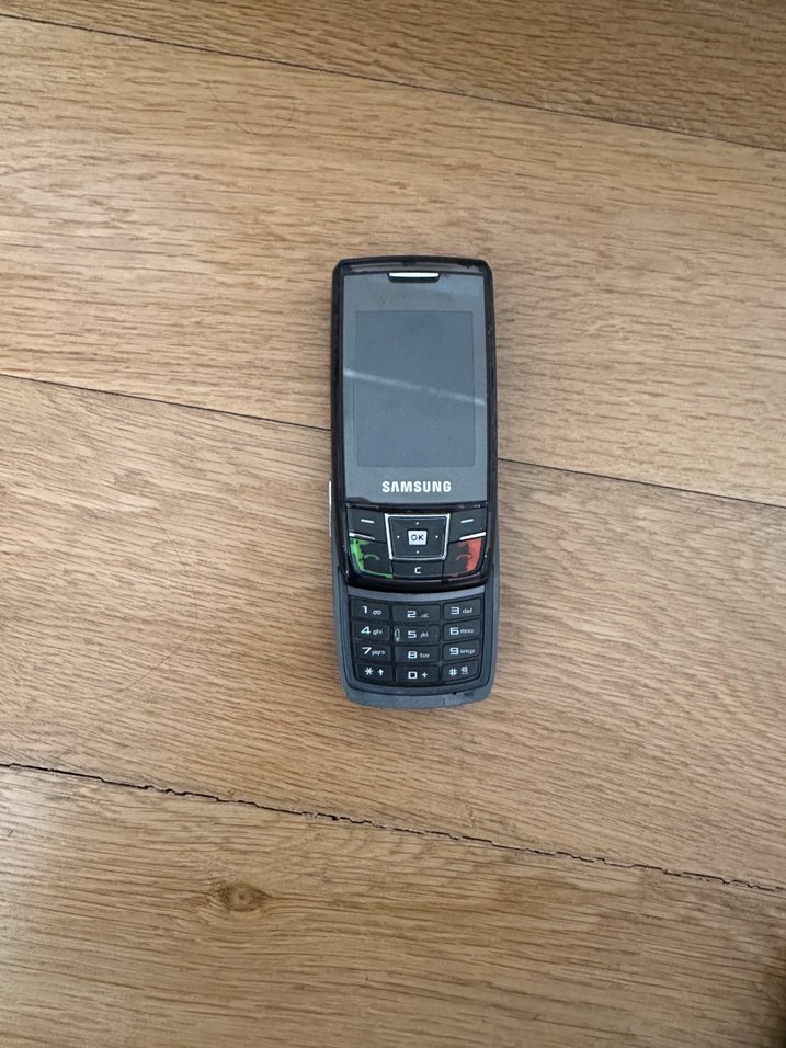 Küçük ekranlı ve sayısal tuş takımlı siyah Samsung kayar kapaklı telefon. Telefon çalışmıyor, bozuktur. Şarj cihazı yoktur.