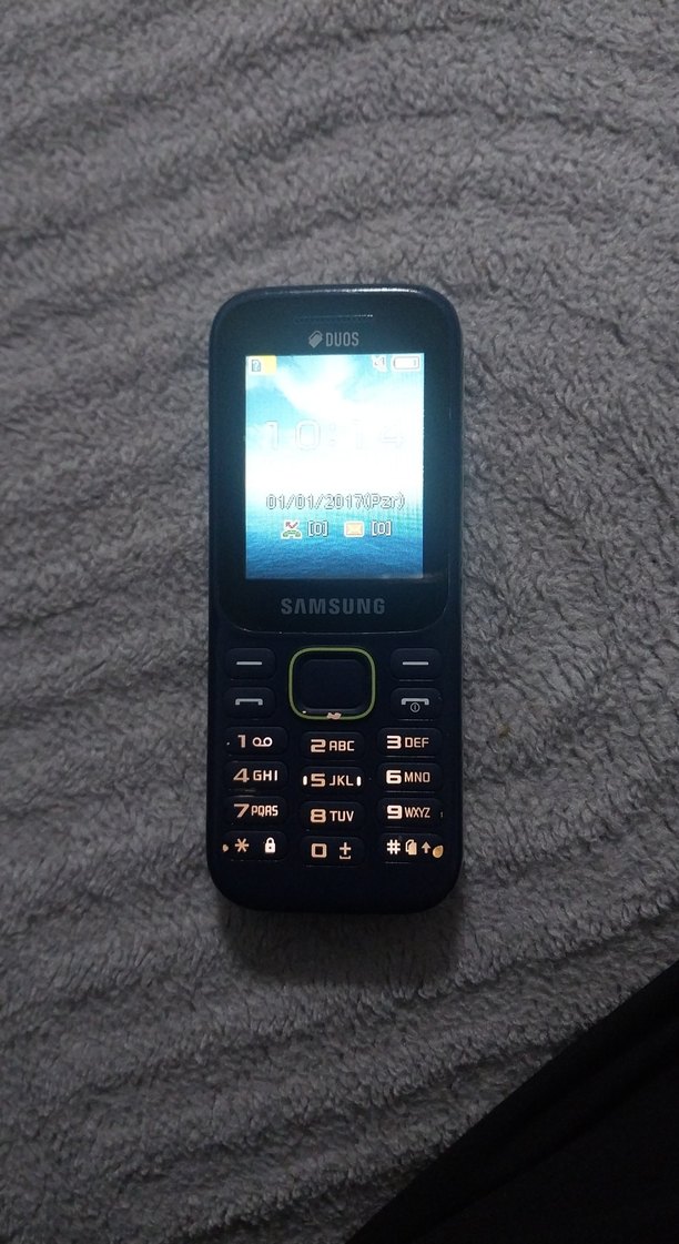 Siyah ve sarı renkli, küçük ekranlı ve fiziksel tuş takımlı Samsung basit telefon. Çift SIM desteği bulunur.