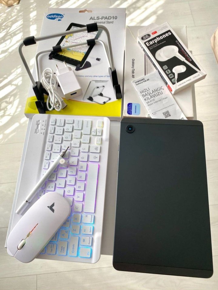 samsung a9 çok az kullanıldı, full set stand, kablosuz klavye, mouse ve kulaklık içeren set. ALS-PAD10 modeli. Çok yönlü kullanım için uygun.