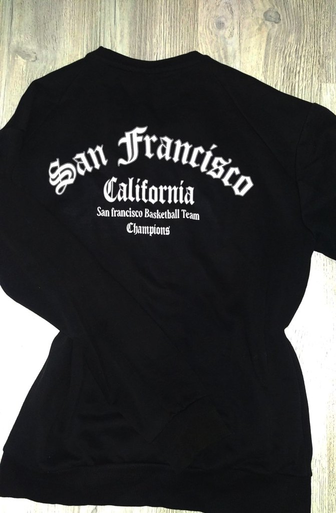 Siyah, uzun kollu, bisiklet yakalı sweatshirt. San Francisco basketbol takımı baskılı, bol kesim ve normal boyda, sentetik kumaştan üretilmiştir.