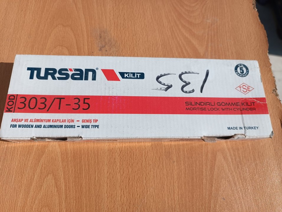San markalı, parlak bej renkte, geniş tip silindirli mortise kapı kilidi model kiti. Üzerinde -35, SILINDIRLI, MORTISE LOCK yazıları bulunur.