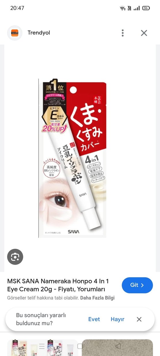 SANA Nameraka Honpo 4'ü 1 Arada göz kremi, koyu halkaları ve donukluğu kapatan E vitamini içeren formüle sahiptir. Soya izoflavonları göz bakımı sağlar. 2027 son kullanım tarihi 1800 güncel satış fiyatı