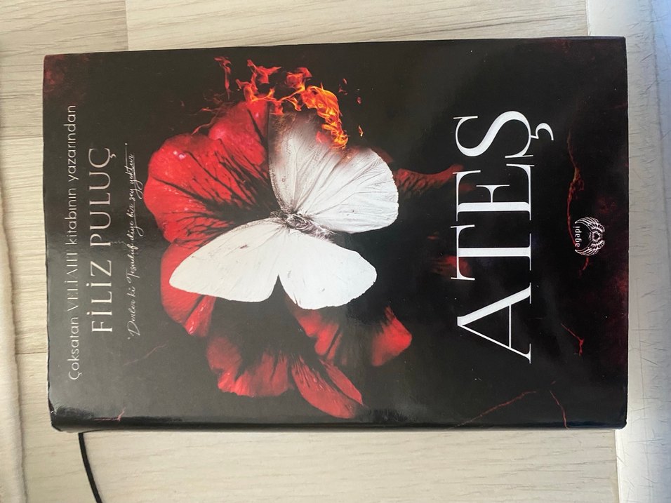 Ateş temalı beyaz kelebek ve kırmızı çiçek görselli sanat kitabı. Sanat severler için uygun.