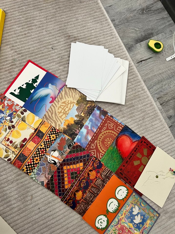 Çeşitli renkli ve desenli tasarımlara sahip sanat temalı kart seti. Farklı sanatsal stiller ve motifler içerir. Kart postal zarfları ve özel kutusuyla gönderilecektir