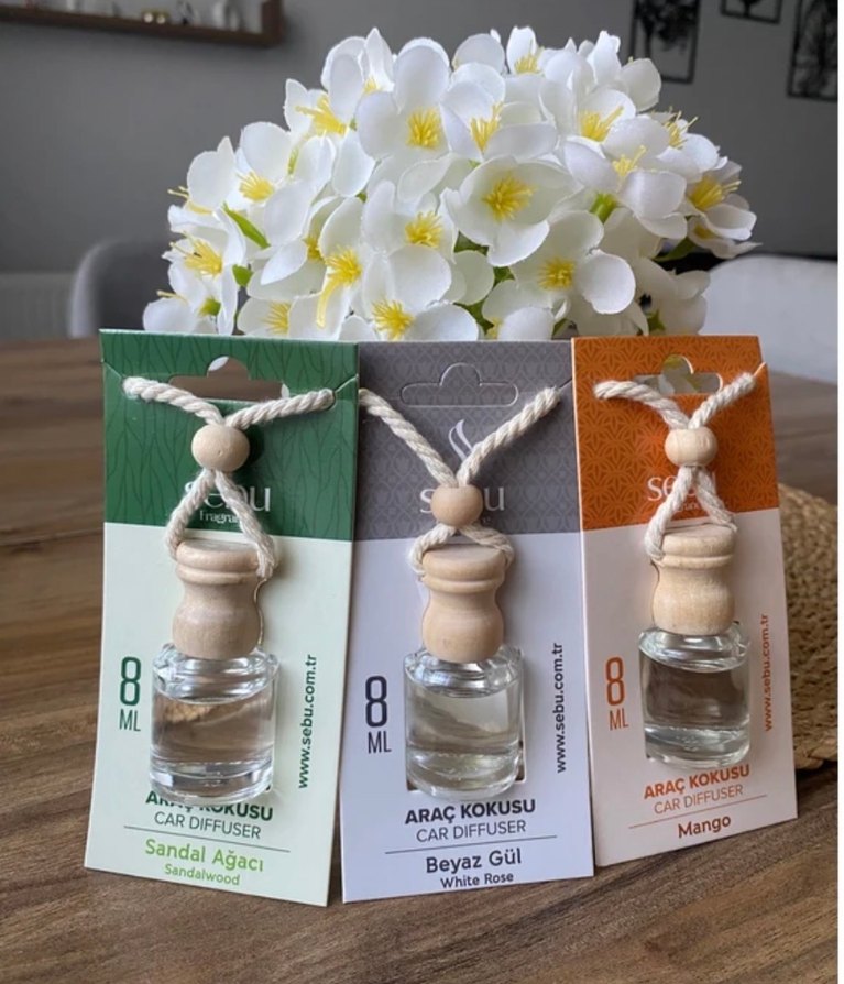 Sandal ağacı, beyaz gül ve mango kokularında, 8 ml kapasiteli, ahşap kapaklı ve ipli araç kokuları.