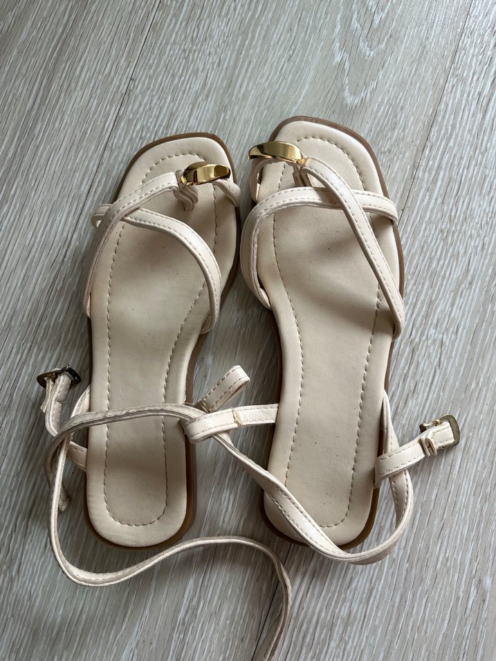 Beyaz, tokalı ince topuklu kadın sandaletleri, minimalist ve bohem tarzda, yumuşak kauçuk malzemeden yapılmıştır. Günlük kullanım için uygundur.