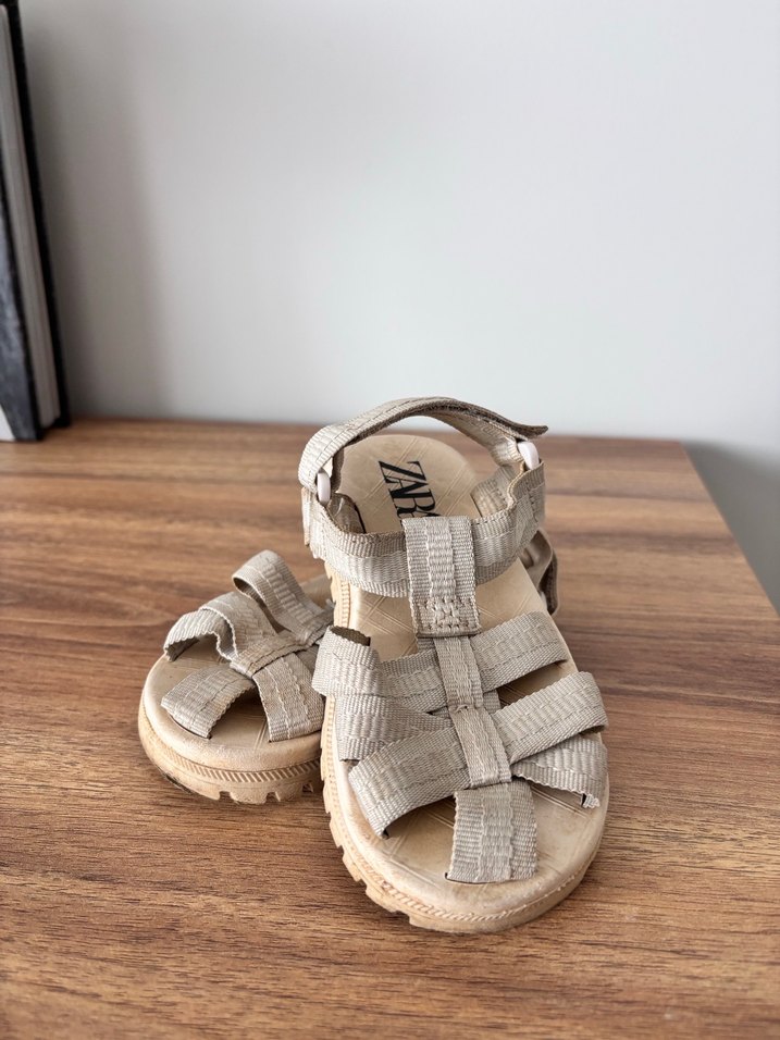 Bej renkte, ahşap tabanlı, tokalı kayışlara sahip, minimalist ve bohem tarzda erkek sandaletler.