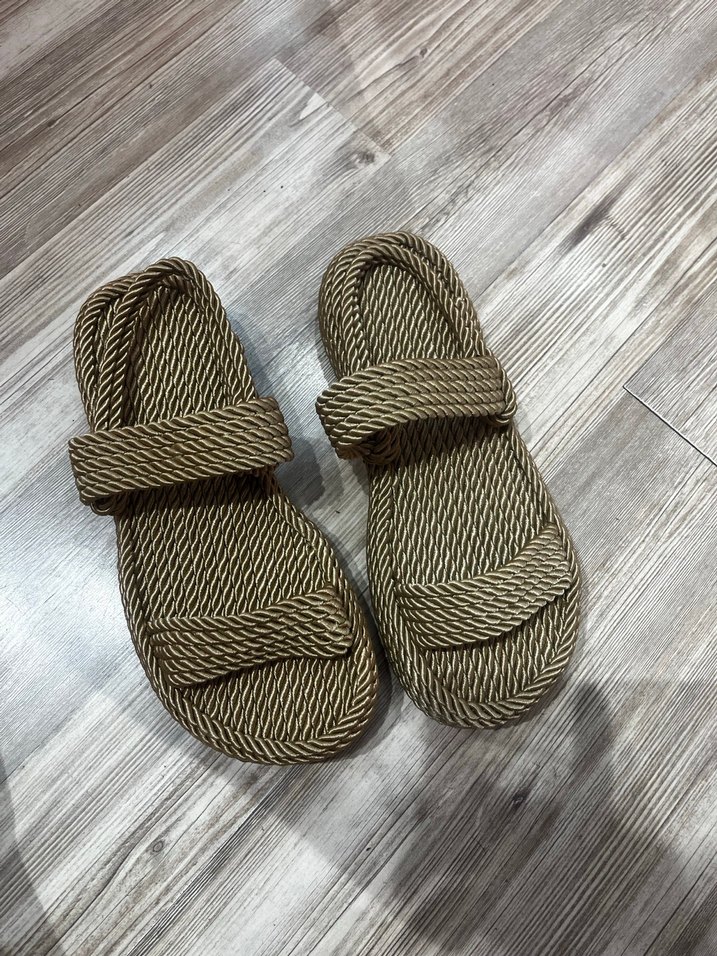 Minimalist bohem tarzda, iki bantlı kahverengi dolgu topuklu kadın terlik, rahat kauçuk tabanlı, günlük kullanım için uygun. Sorunsuz dore renk
