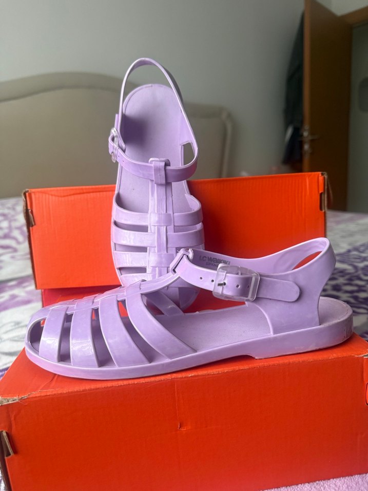 Kızlar için mor, tokalı ve kauçuk tabanlı sandalet. Sokak stiline uygun, desensiz ve şık tasarım.