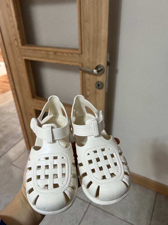 Kız çocukları için beyaz, tokalı, dayanıklı kauçuk malzemeden yapılmış sade ve desensiz terlikler. Hafif ve günlük kullanıma uygun.