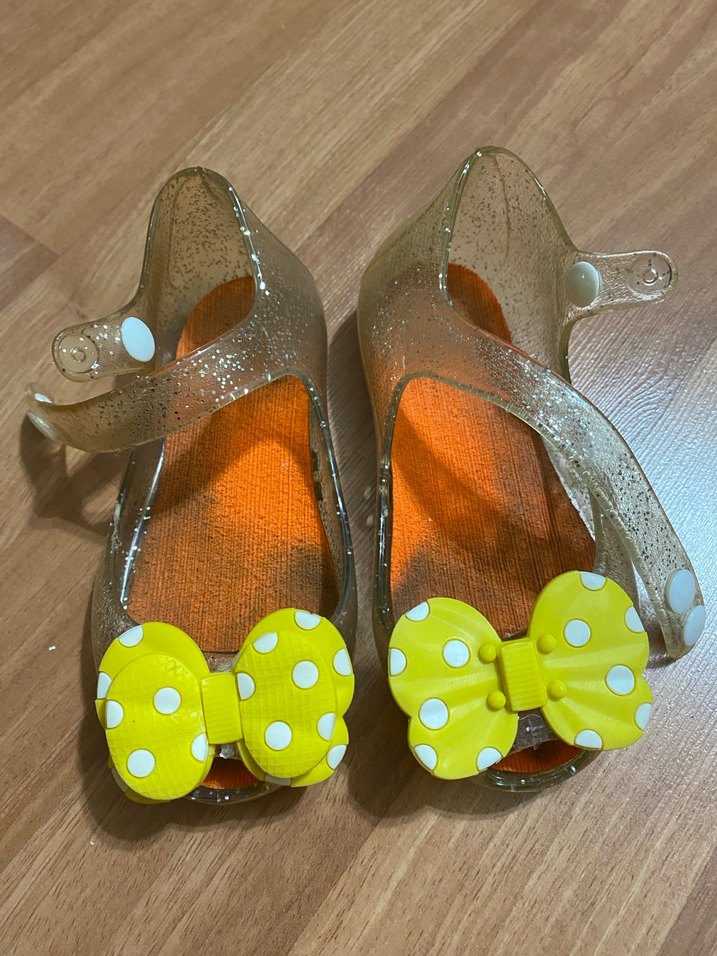 Sarı puantiyeli fiyonklu, esnek kauçuk malzemeden yapılmış kız sandaletleri, sokak stili için uygundur.
