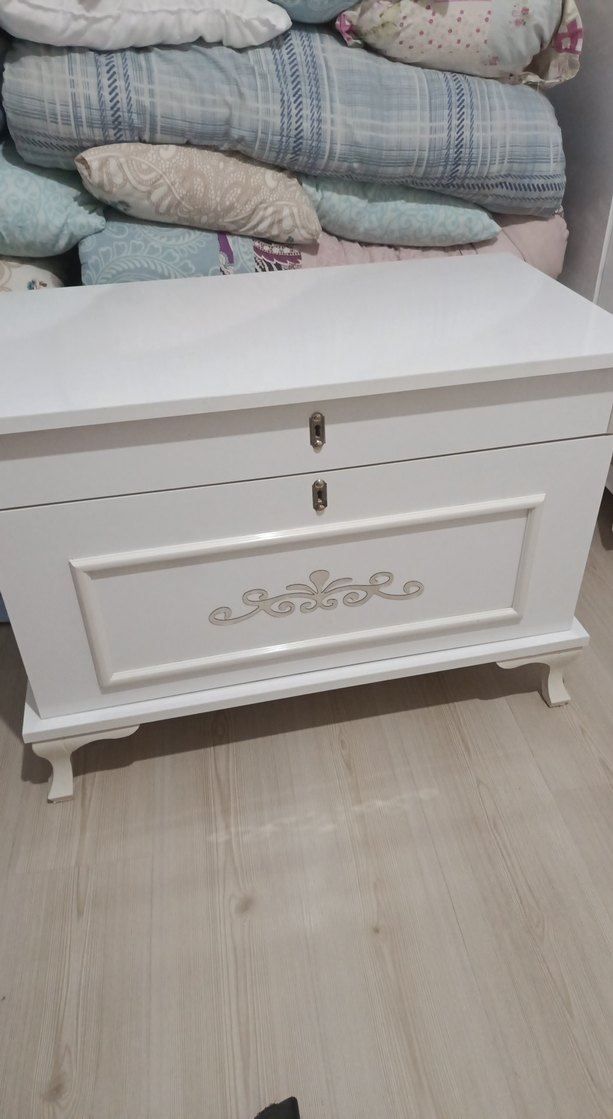 Dekoratif ön panel ve kilitli beyaz çocuk şifonyeri, pürüzsüz yüzey ve sağlam ayaklara sahip.