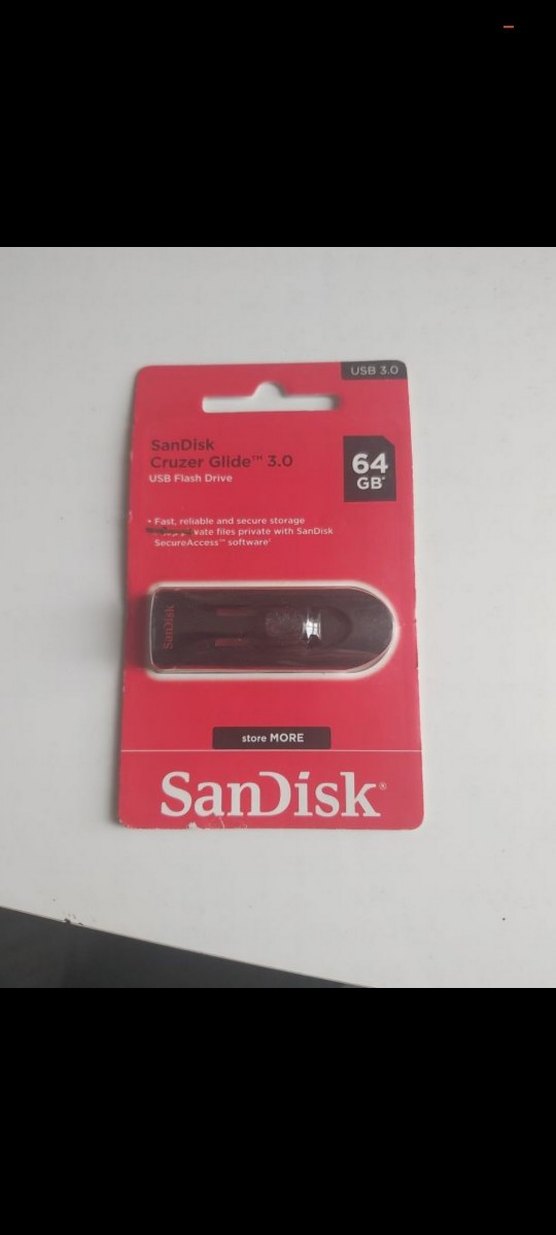 Kırmızı plastik kasada SanDisk 64GB USB 3.0 flash bellek, hızlı ve güvenli depolama sunar. SecurAccess yazılımı ile veri aktarımı için kullanışlıdır.