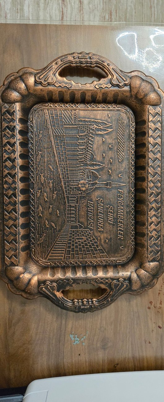 Kahverengi tepsi Şanlıurfa temalı işlemeli desen ve 'HATIRAS, PEYGAMBERLER, SEHRI' yazıları içerir.