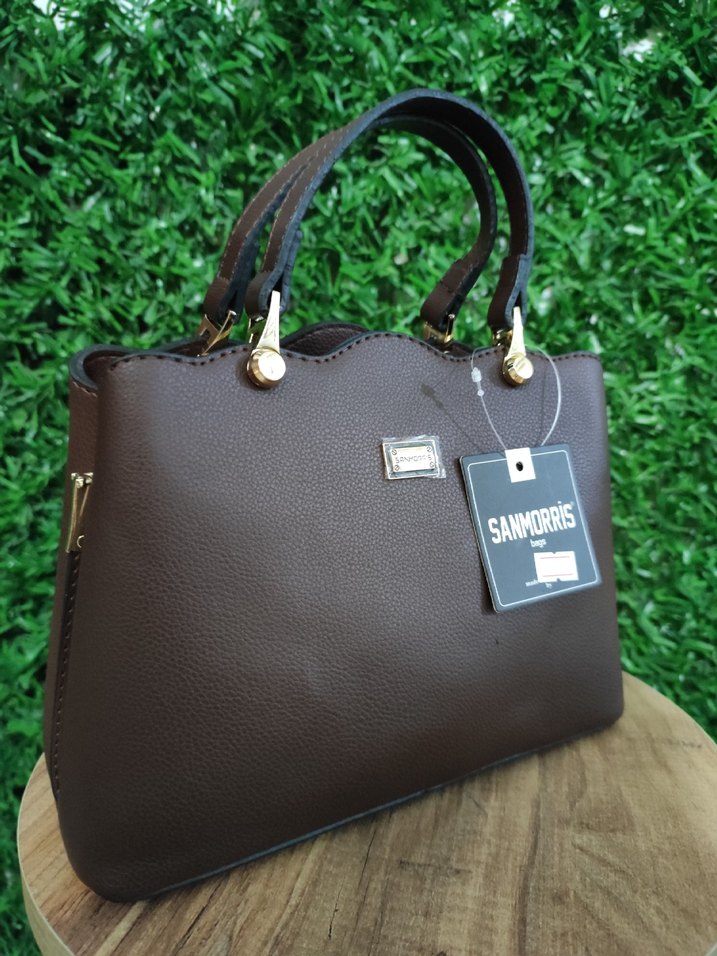 Sanmorris markalı kadın çanta, parlak kahverengi deri ve baskılı desene sahiptir. Fermuarlı ve çağdaş tasarımlıdır, klasik zarafet için uygundur.