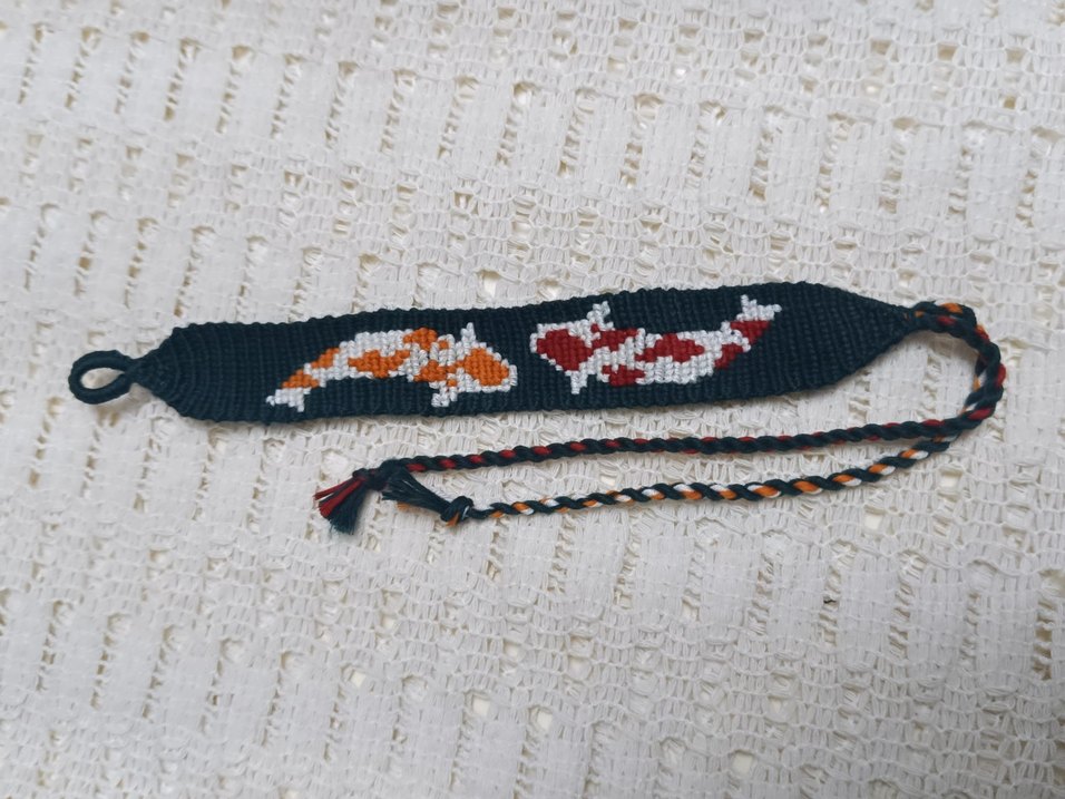 El yapımı Koi balığı desenli bileklik Tamamen el emeğiyle yapılmıştır. Kaliteli iplerle örülmüş olup dayanıklıdır. Nefti zemin üzerine turuncu ve kırmızı-beyaz koi balığı desenleriyle dikkat çeker. Hem kadın hem erkek kullanımına uygundur. Bileğe göre ayarlanabilir örgü uçlara sahiptir. ✨ Renkli, özgün ve anlamlı bir aksesuar arayanlar için harika bir seçenek!