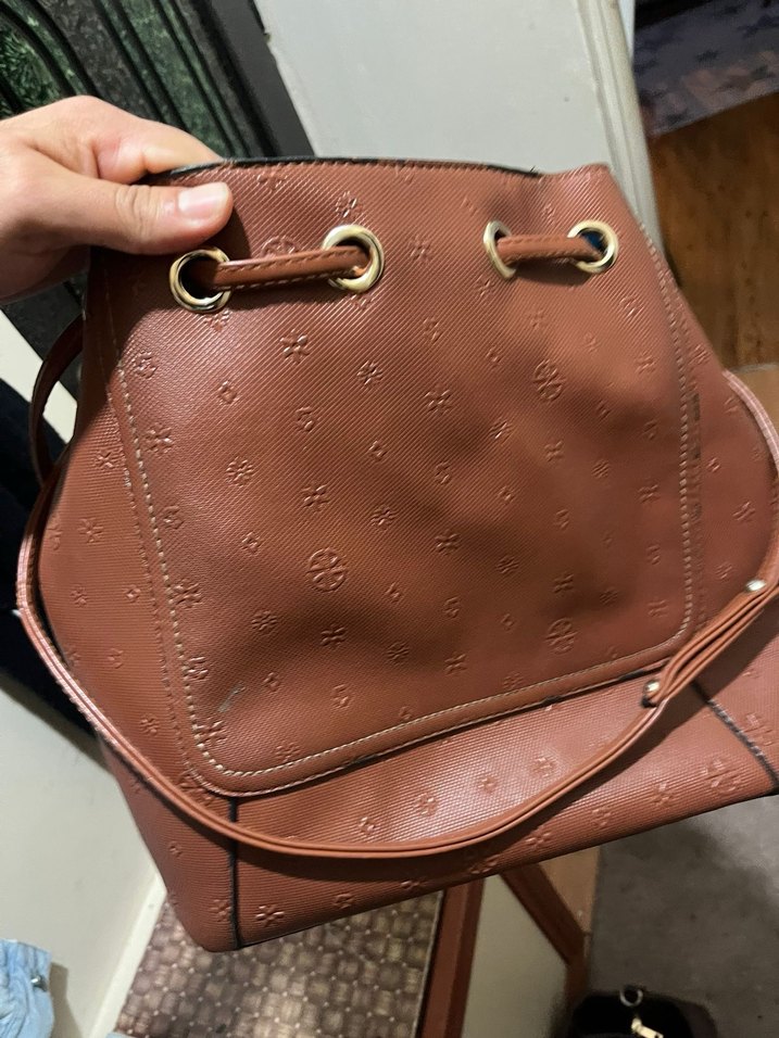 Kahverengi deri kadın çanta, tokalı detaylara ve parlak yüzeye sahip, trend sokak stiline uygun şık bir modeldir.
