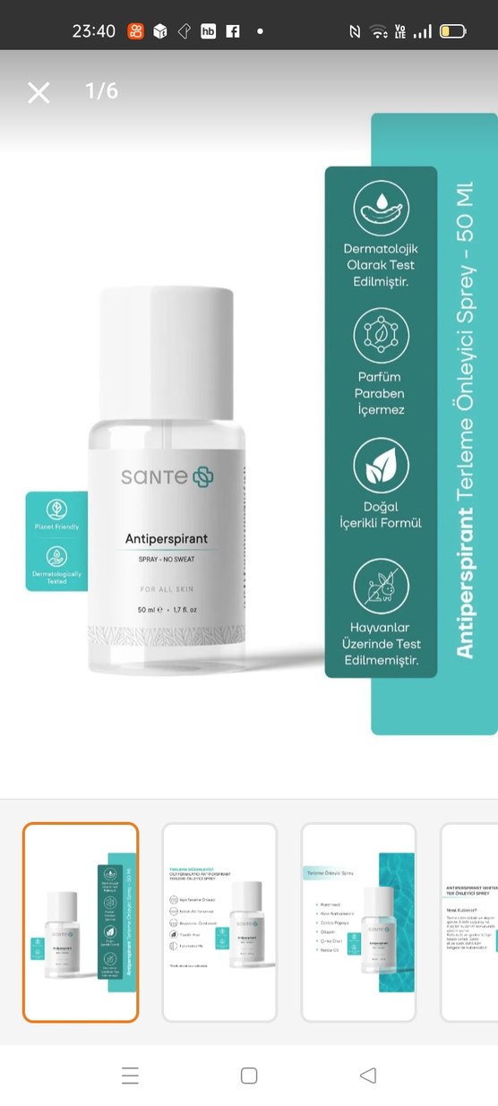 Sante kadın antiperspirant spreyi, terlemeyi önleyen doğal içerikli formüle sahiptir. Dermatolojik olarak test edilmiştir, paraben ve parfüm içermez, hayvanlar üzerinde test edilmemiştir.