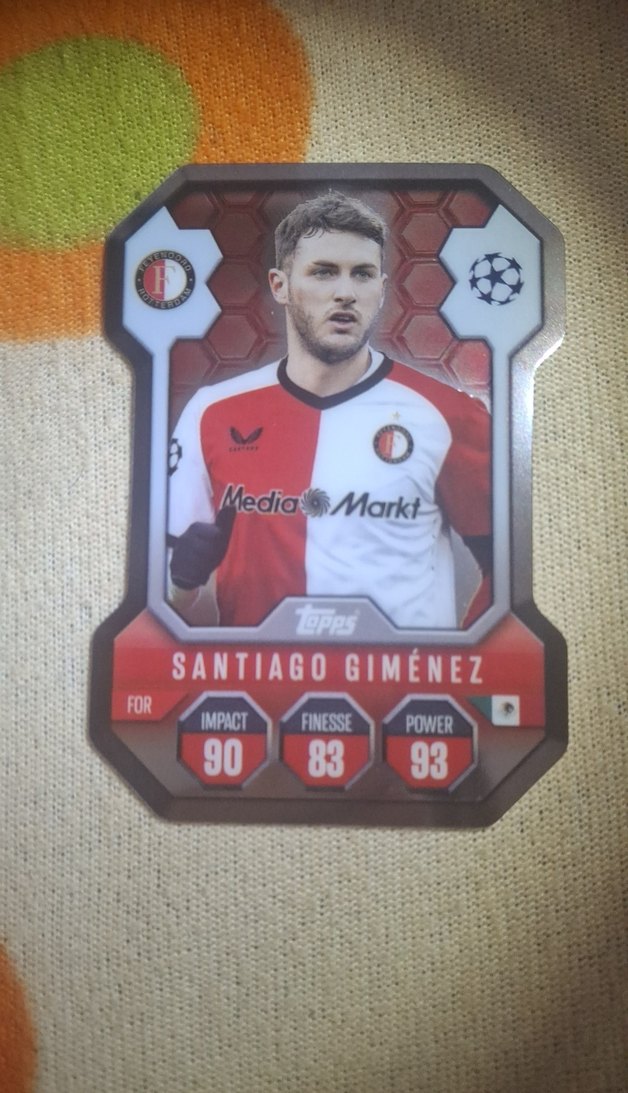 Kırmızı-beyaz renkte Santiago Giménez'in futbol formasıyla yer aldığı, güç, etki ve beceri puanlarını gösteren futbol rozeti. Cesur athleisure tarzında. ⚽