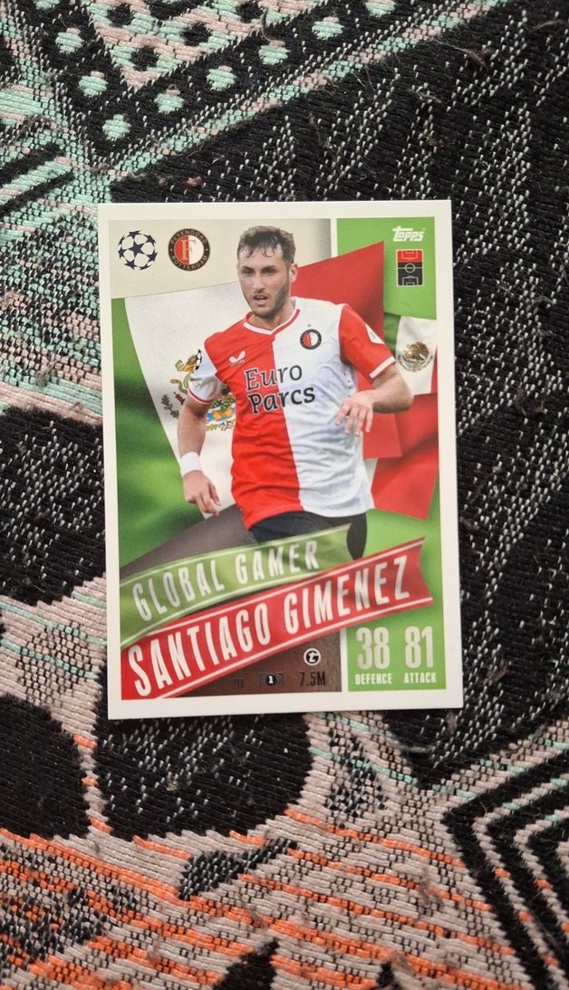 Santiago Gimenez'in kırmızı rozetinde spor ve pop kültür tarzı var. "3881" ve "Parcs" gibi yazılar bulunuyor. ⚽