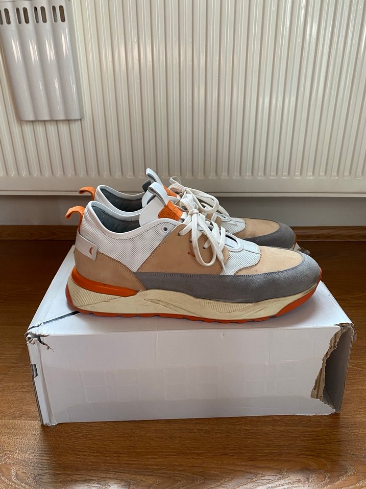 Turuncu detaylarla şık bir spor ayakkabı Çok az giyildi 6-7 kez Santoni marka ama fason üretim Detayları vs. oldukça iyidir 45 numara Büyük geldiği için ben satıyorum