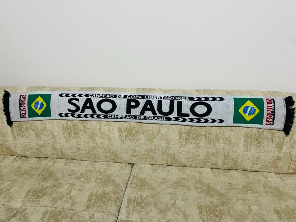 Bej ve gri renklerde, üzerinde 'SAOPAULO' yazan baskılı yoga kayışı. Esneme ve yoga hareketleri için uygundur. ♀️