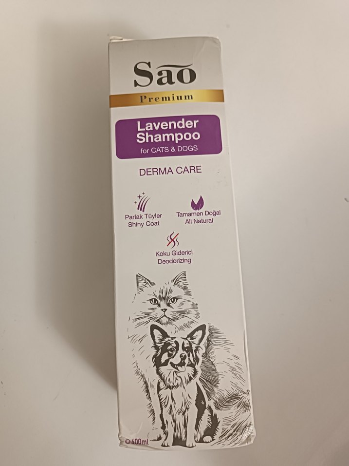 Sao Premium Lavanta Özlü Şampuan, kedi ve köpekler için parlak tüyler, koku giderici ve tamamen doğal içerik sunar.