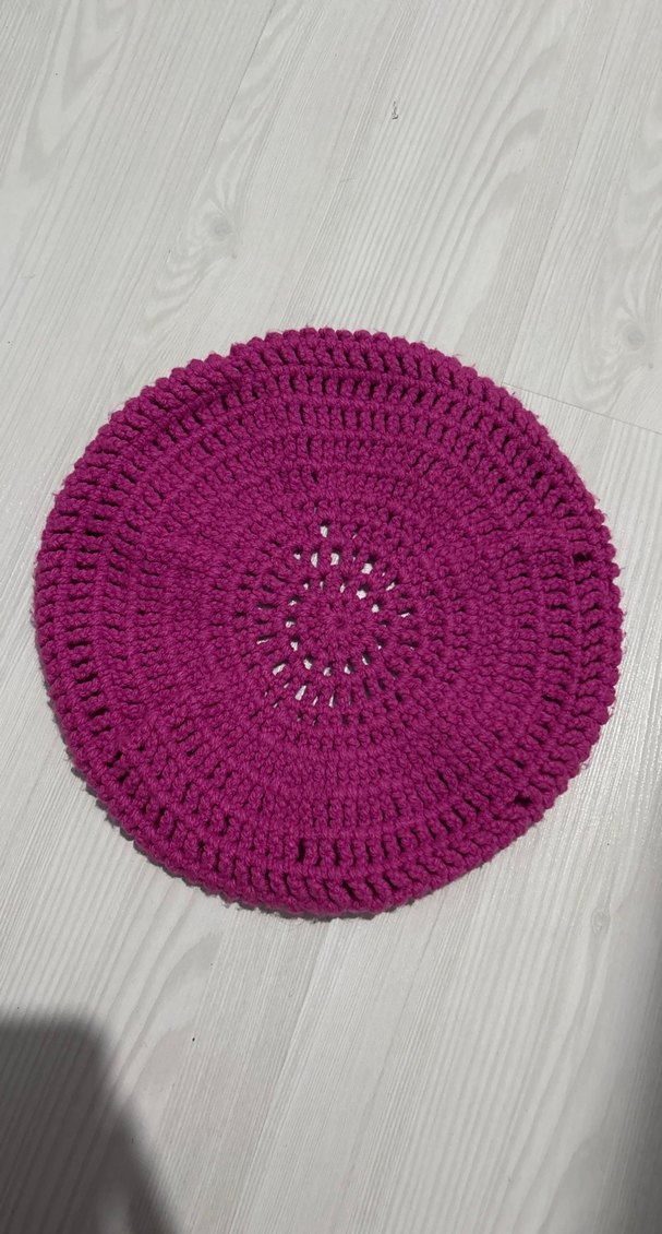 Canlı mor renkte, el örgüsü yuvarlak şapka