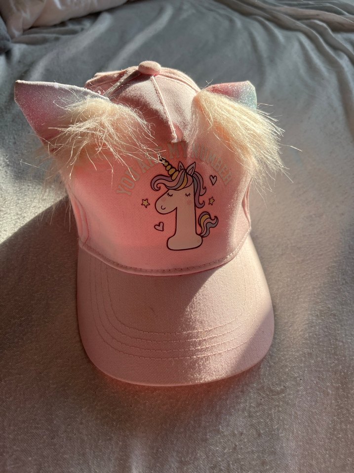 Peluş detaylı kulakları ve unicorn baskılı deseniyle pastel pembe çocuk şapkası 6-10 yaş
