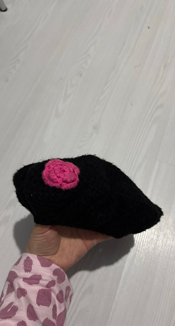 Bu siyah örgü yün bere, koyu pembe gül detayıyla rahat ve gotik tarzı şık şekilde birleştirir.
