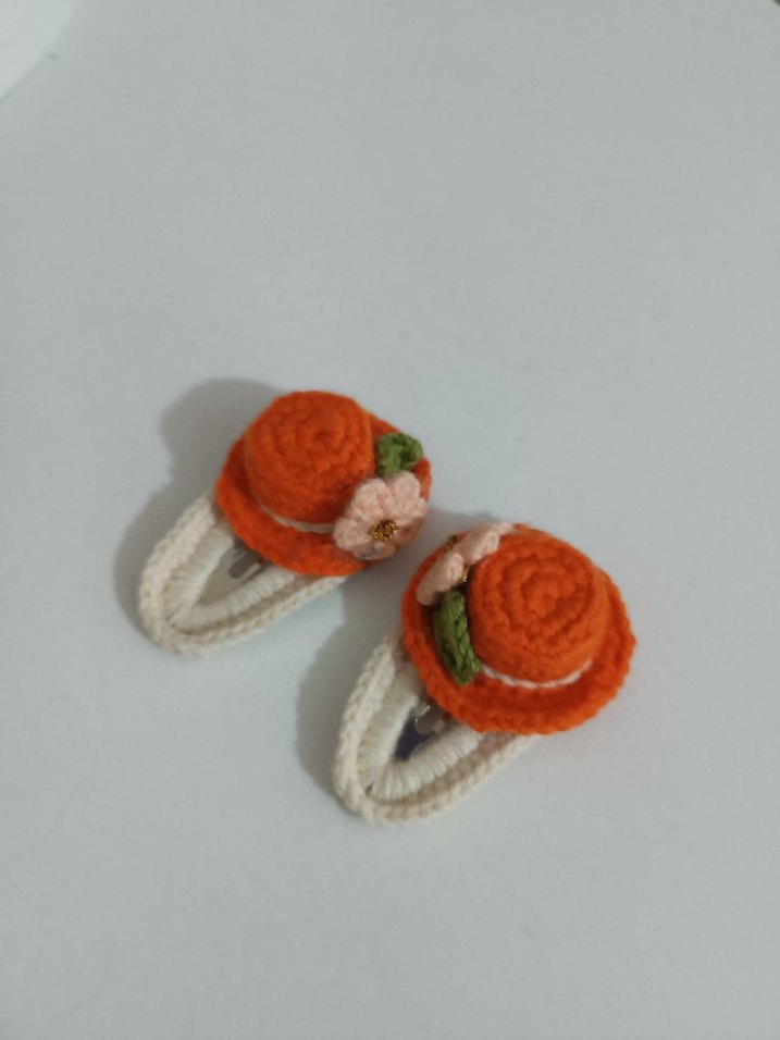 Renkli, örgü çocuk tokaları turuncu şapka ve nakışlı çiçek detaylarıyla bohem tarzda tasarlanmıştır.