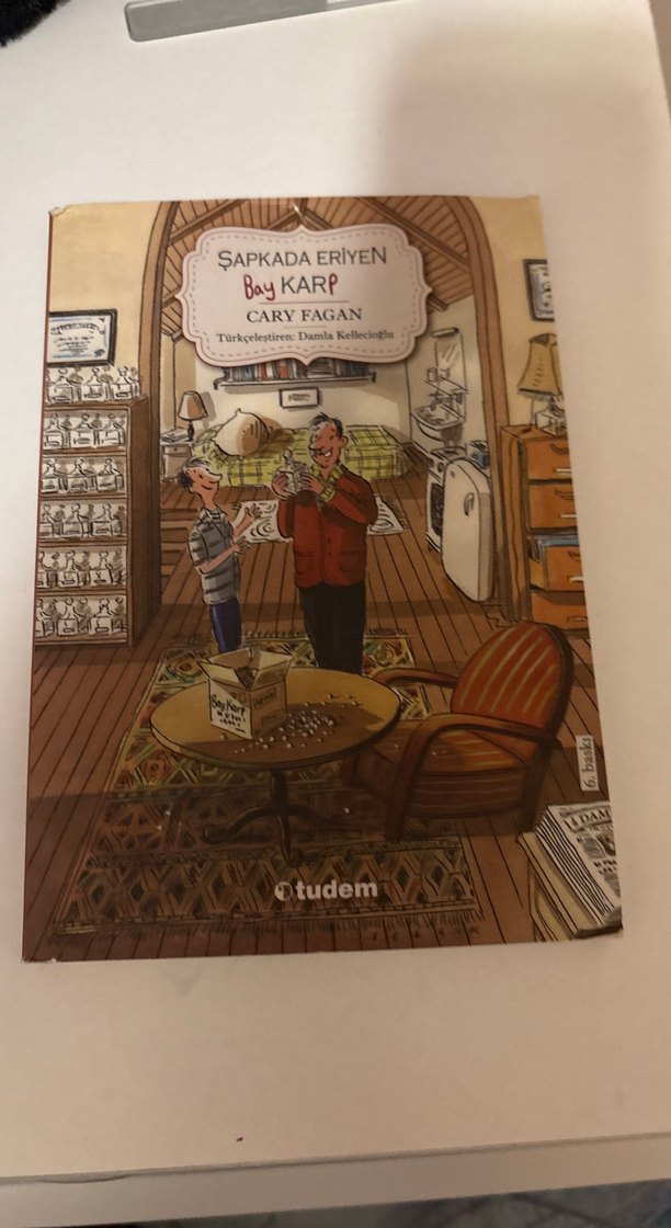 Cary Fagan'ın 'Şapkada Eriyen Bay Karp' adlı çocuk kitabı, Türkçeye çevrilmiş. Kapakta iki karakterin olduğu çizimli bir iç mekan yer alıyor.