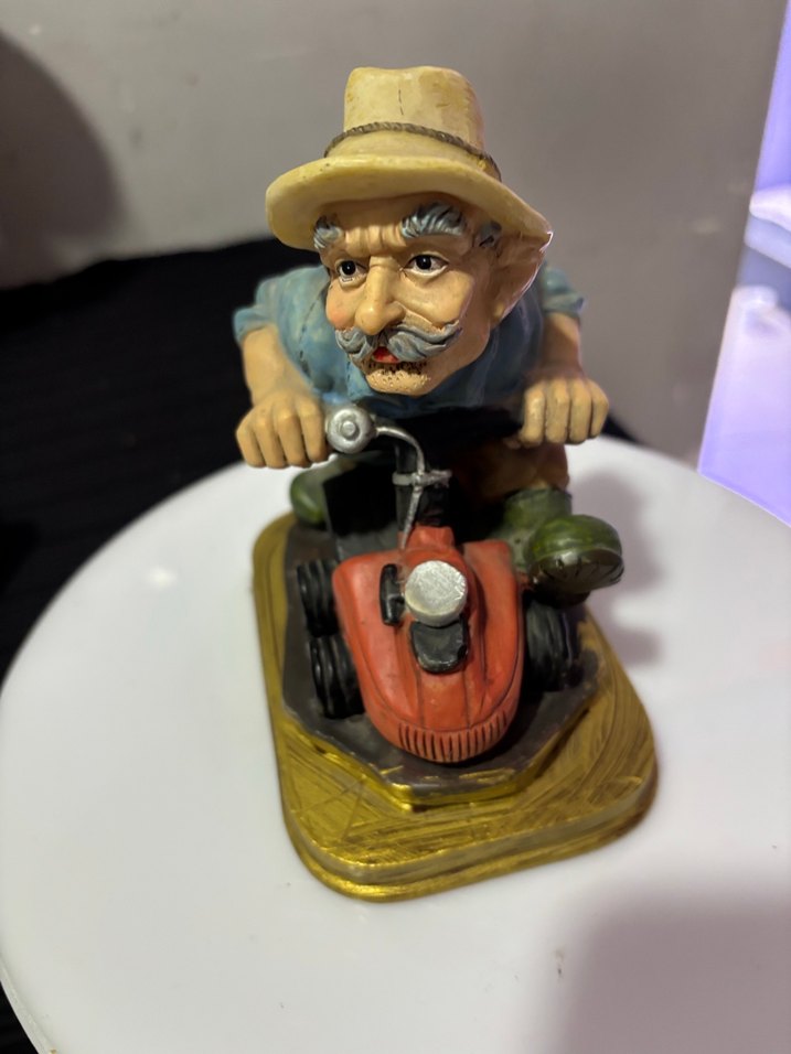 Camel renginde şapkalı yaşlı adam figürü, kırmızı-siyah scooter üzerinde, altın renkli kaide üzerinde. İthal üründür