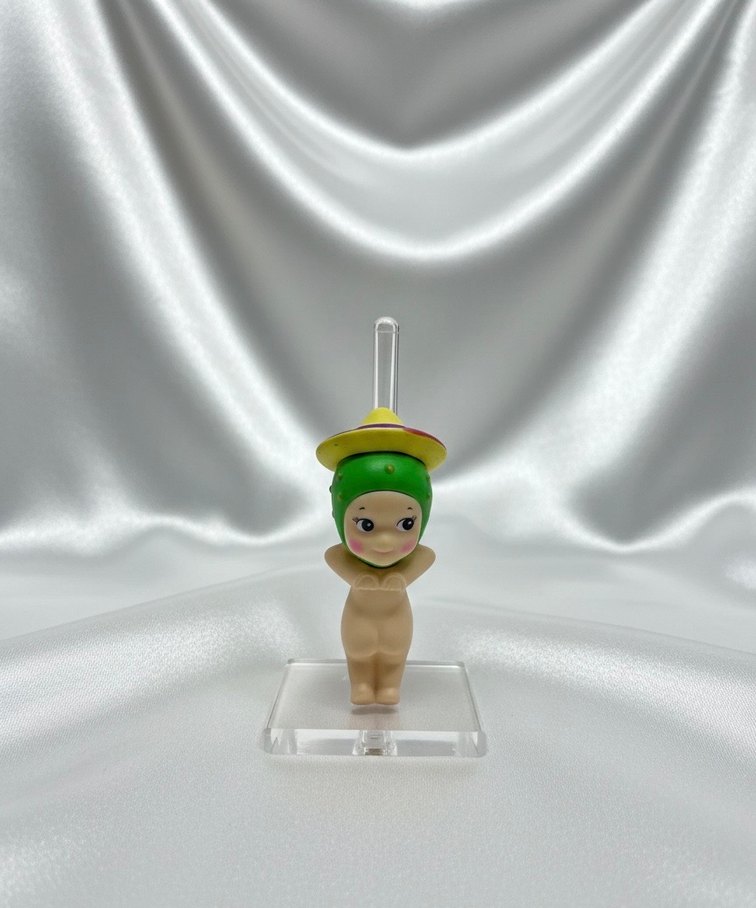 Şapkalı ve açık renkli küçük aksiyon figürü, şeffaf bir taban üzerinde duruyor. Sevimli ve eğlenceli bir tasarıma sahip.
